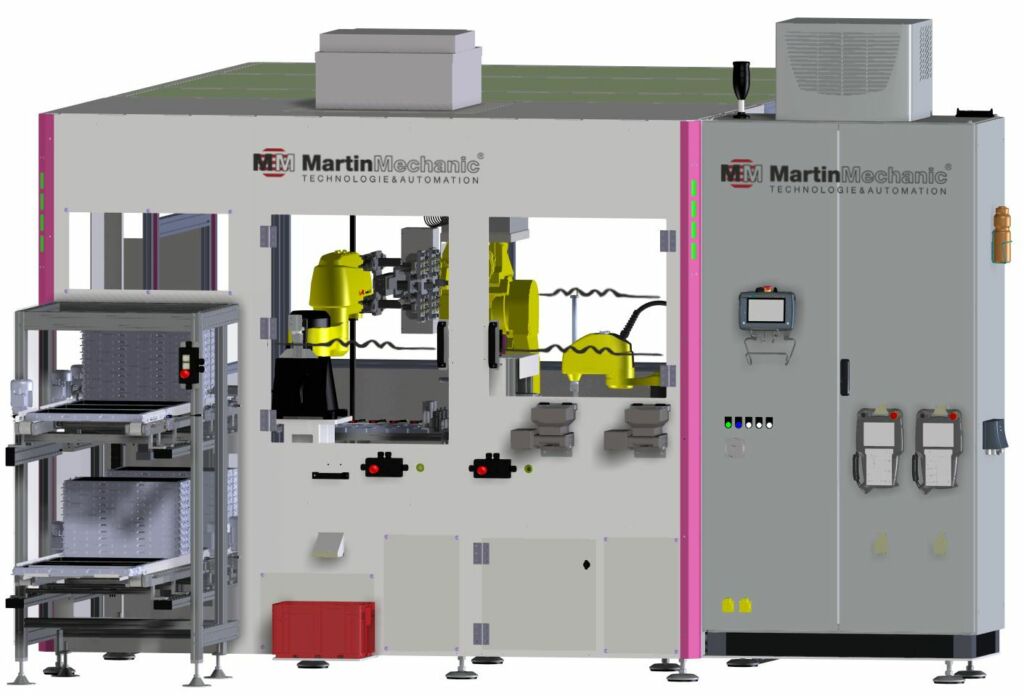 MartinMecharnic hat die Fertigungsinsel MSB242812 so konzipiert, dass zwei 2K-Spritzgießmaschinen im Verbund für die Ummantelung von Sicherheitsmembranen für das Strommanagement in Batterien eingesetzt werden können. Der Sechsachsroboter M710 von Fanuc bedient beide Spritzgießmaschinen, die links und rechts von ihm angeordnet sind. Für die Produktion sind weitere Scara-Roboter im Einsatz. Die Buchsen werden den Robotern über einen Zuführtopf und dann mehrfach bereitgestellt. Nachdem sie umspritzt worden sind, entnimmt der Roboter drei fertige Teile und legt sie in Trays ab. Je zehn Trays mit 21 Bauteilen werden platzsparend auf zwei Ebenen übereinandergestapelt. Ein Lift befördert die Trays von der oberen in die untere Ebene, wo sie ein AMR abholt, zwischenlagert und danach auf den Lift der zweiten Spritzgießmaschine setzt. Nun werden die Bauteile in einer Tiefziehform mit einer Weichkomponente ummantelt und die Sicherheitsmembran in Mold eingespritzt. Anschließend wandern sie in eine Kühlstation. Mit Hilfe einer Bildverarbeitungslösung werden die Arbeitsschritte geprüft.