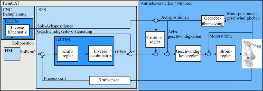 Als zweite Einschränkung ist die Sollwertvorgabe zu nennen, bei der im Fall von Industrierobotern nahezu ausschließlich eine Vorgabe von Positionswerten ermöglicht wird. Dadurch wird die Implementierung angepasster Regelungskonzepte für neue Prozesse erschwert. Allerdings ist der Trend zur softwaredefinierten Fertigung und mehr Offenheit in der Steuerung auch in der Roboterindustrie erkennbar. Während kollaborative Roboter wie der Panda von Franka Emika schon jetzt Schnittstellen zur Vorgabe von Motormomenten zur Verfügung stellen, bietet Autonox Robotics steuerungsunabhängige Robotermechaniken auch für serielle Kinematiken im höheren Lastbereich an.
